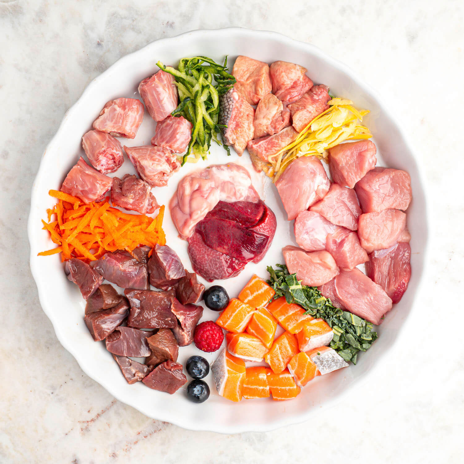 Pork meat, pork hearts, pork/chicken/turkey/duck necks or rabbit backs, beef kidney, pork liver, salmon, vegetables.
